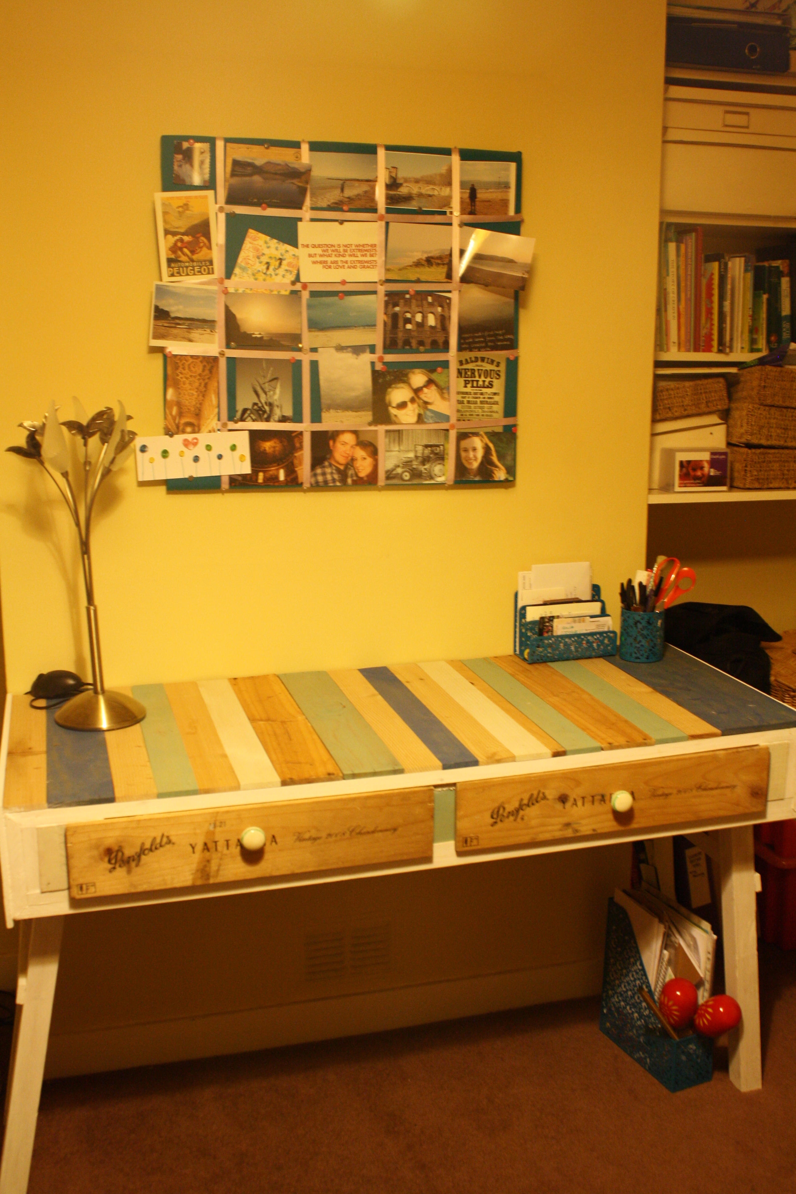 ADMIRING my beautiful new desk, which Andrew made for me out of a load of old crates. We’re now working on some better book storage for me.