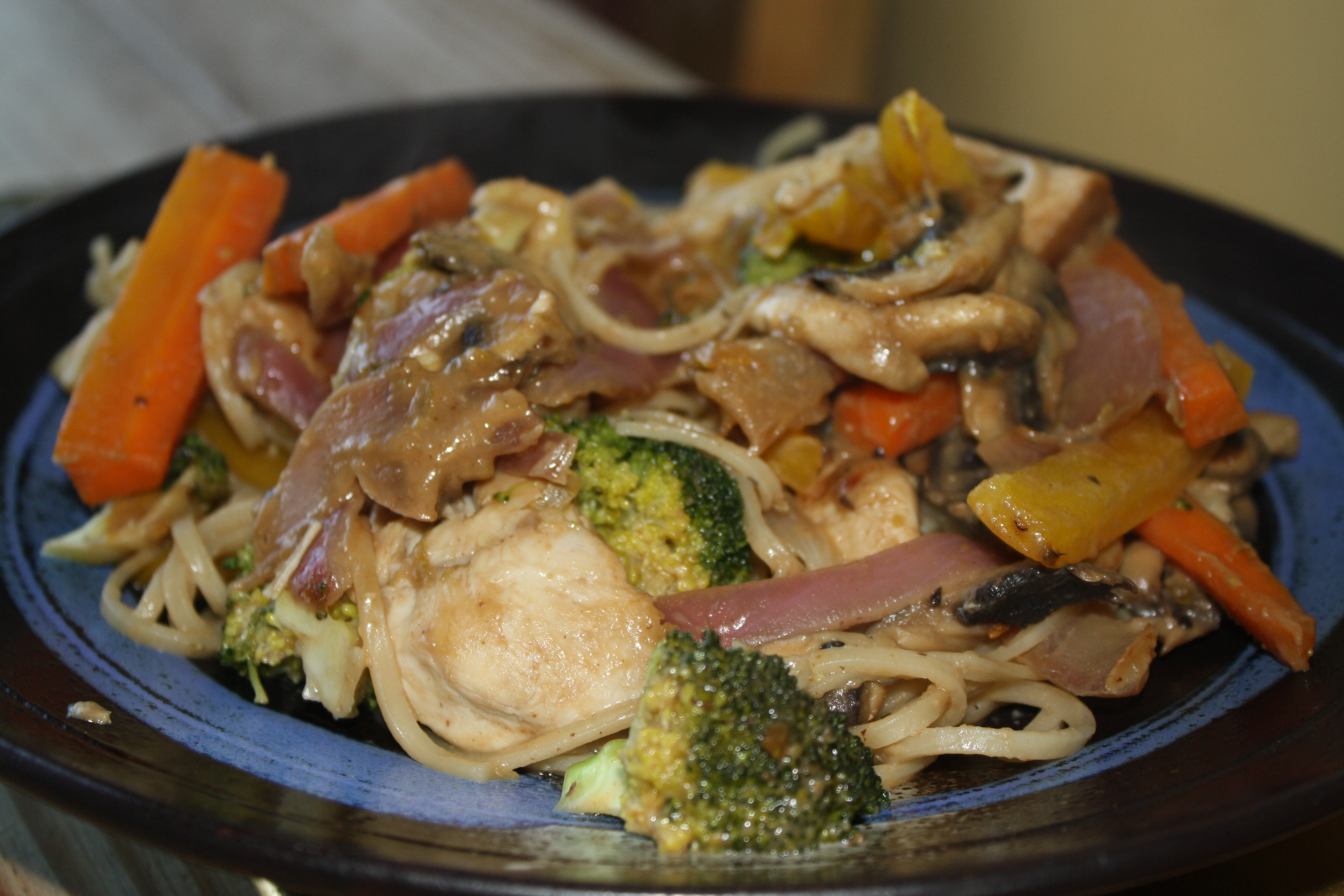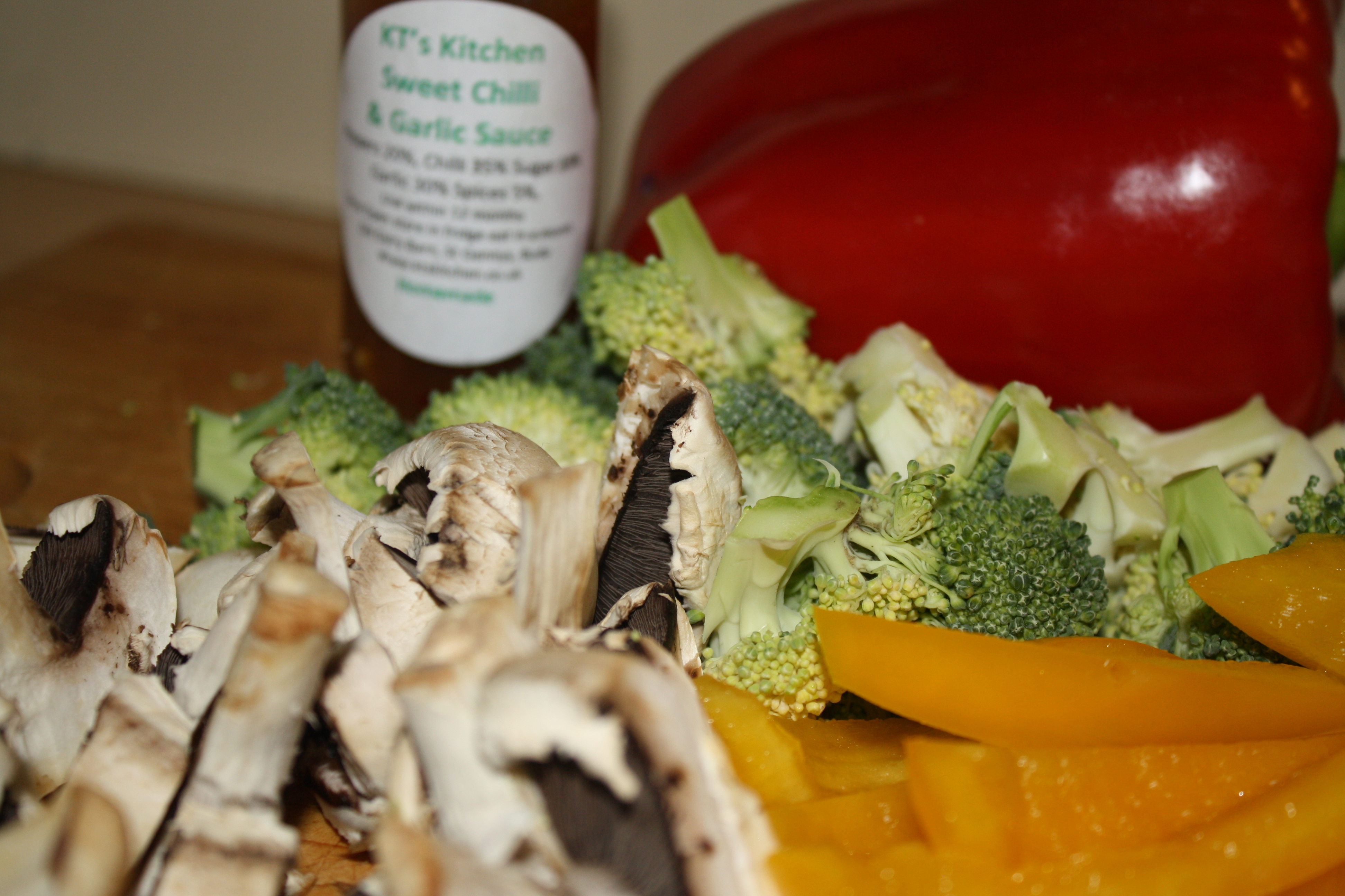 Kate sells a range of cooking sauces, spice mixes, oils and other treats and I couldn’t resist giving one a try. We had the Sweet Chilli and Garlic sauce and it was soo good 🙂 I stir fried chicken and noodles along with the market vegetables (1/2 a large red onion, 1 large yellow pepper, 1 broccoli, 1 carrot, a handful of mushrooms) in a generous helping of the sauce. I also added a spoonful of Fair Trade Peanut Butter and a squeeze of lime to give it a Pad Thai style flavour, but we could have had the sauce on it’s own too, as it was really tasty.